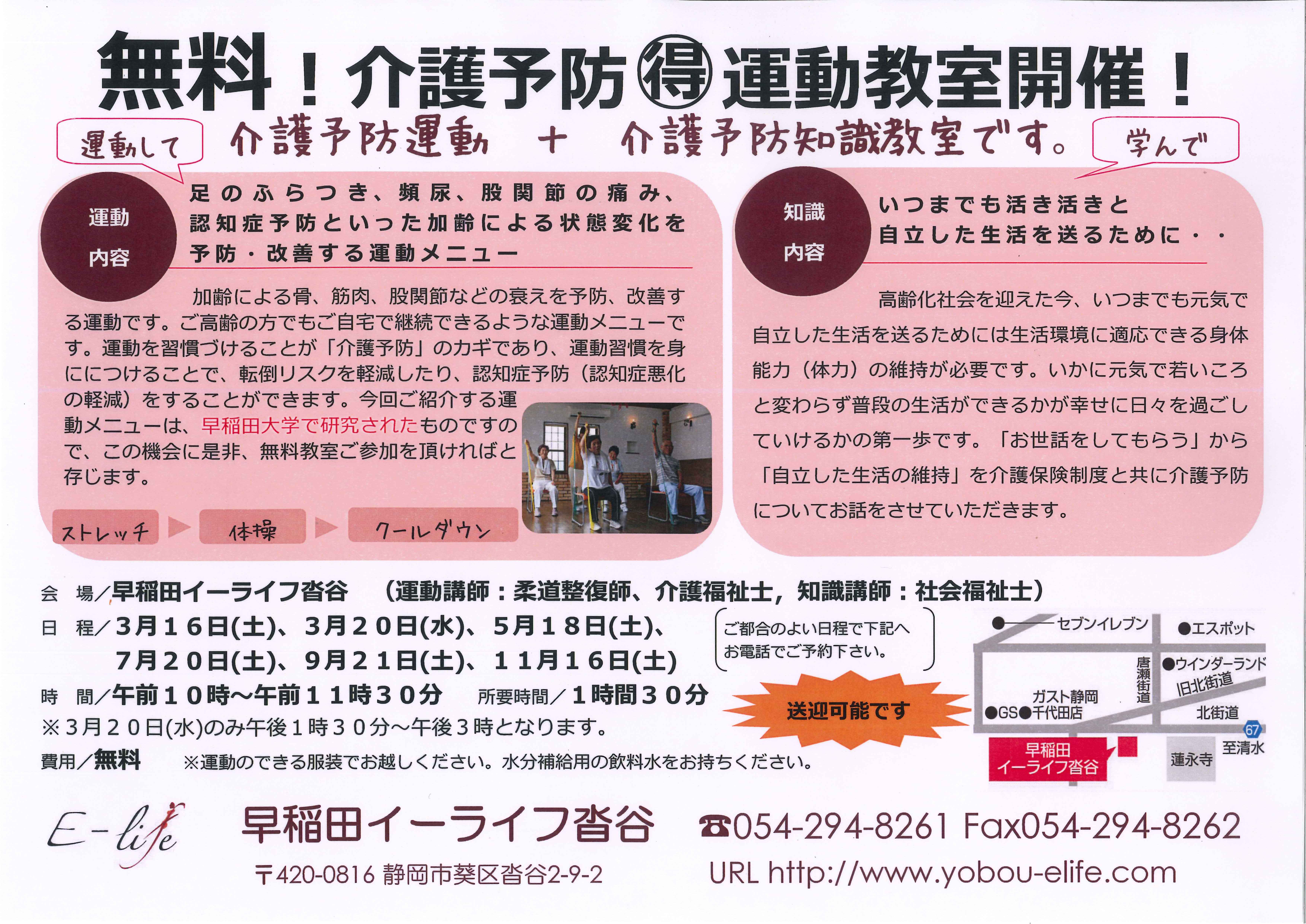 早稲田イーライフ沓谷では、3月度 無料「介護予防運動教室」を3月20日(水)13時30分~に行ないます。約1時間30分で予防運動と介護予防の大切さのお話を約45分づつで行わさせていただきます。介護認定が無い方もご参加できますので、この機会に是非ともご参加をいただければと存じます。 送迎も可能ですので、ご予約の際に御申出ください。 尚、3月16日(土)につきまして、多くのお申し込みをいただき予約を締切させていただきました。恐れ入りますが3月20日(水)でご予約をいただければ幸いです。
